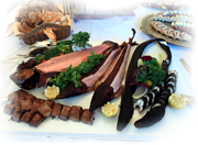 - Hirschbraten, Wildschweinbraten oder Wildgulasch mit Klößen oder Spätzle